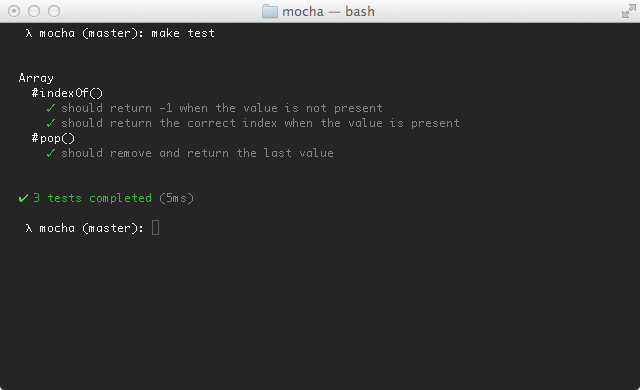 Mocha TextMateバンドルには、テストの作成をより迅速かつ容易にするためのスニペットが含まれています。